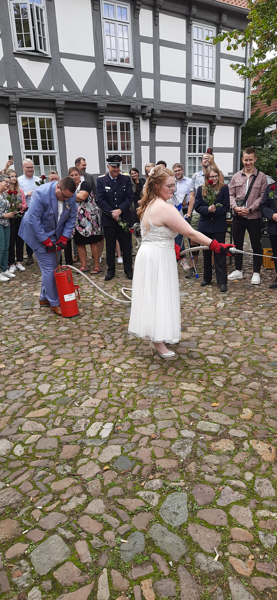 Zu diesem Anlass kamen wir natürlich gerne vorbei und standen Spalier. Mit einer kleinen Löschübung haben die beiden ihren neuen gemeinsamen Lebensweg besiegelt.